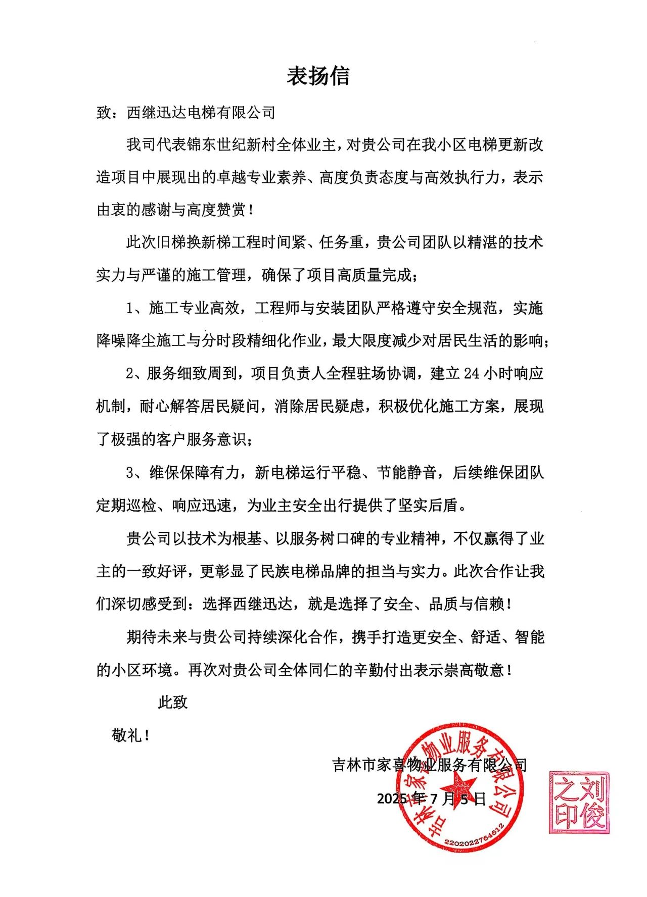 一封來自吉林舊梯改造項(xiàng)目的表揚(yáng)信